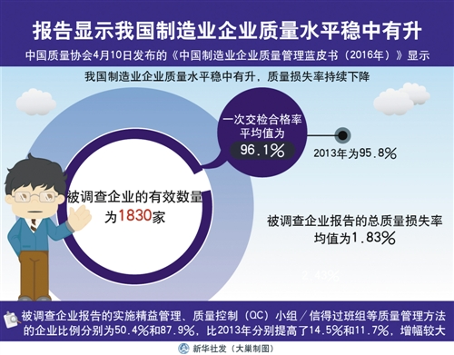 中国质量协会10日发布的《中国制造业企业质量管理蓝皮书(2016年)》显示,我国制造业企业质量水平稳中有升,质量损失率持续下降,质量管理体系认证率高。
