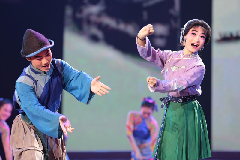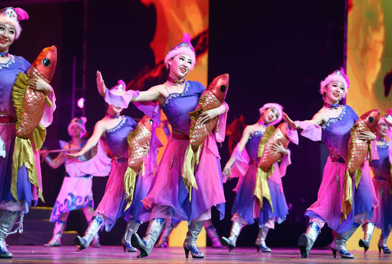 5月8日,佳木斯职教集团的学生在表演赫哲族舞蹈《日出一族》。